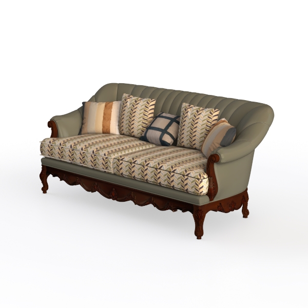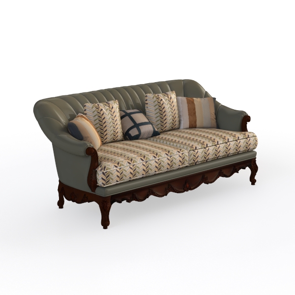 The sofa's intricate wooden legs and detailing add a touch of grandeur, seamlessly integrating into both contemporary and traditional settings. It serves as a stunning centerpiece for a living room styled in a modern luxurious theme, especially when paired with a marble coffee table and metallic accents like floor lamps or decorative trays.
