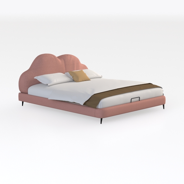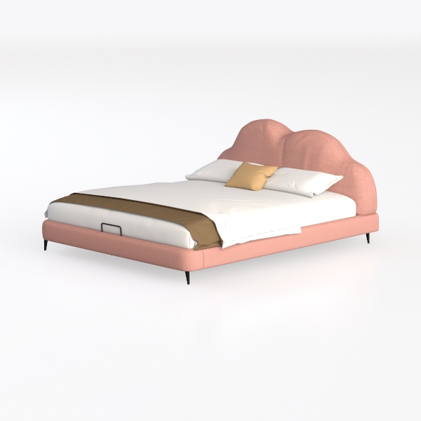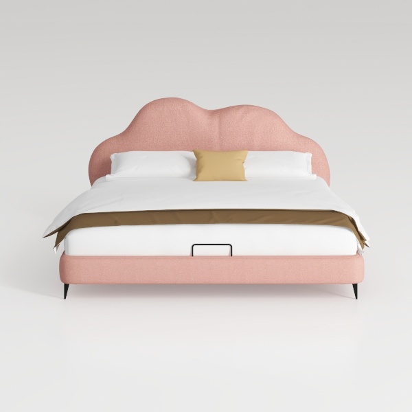 This elegant bed frame merges organic softness with modern minimalism. Its headboard, shaped like a gently undulating cloud, draws inspiration from natural forms, infusing the space with a sense of calm and warmth. Crafted from textured fabric in a warm blush hue, the headboard feels surprisingly soft to the touch, while its subtle sheen catches light softly, creating a gentle glow that transforms the room.