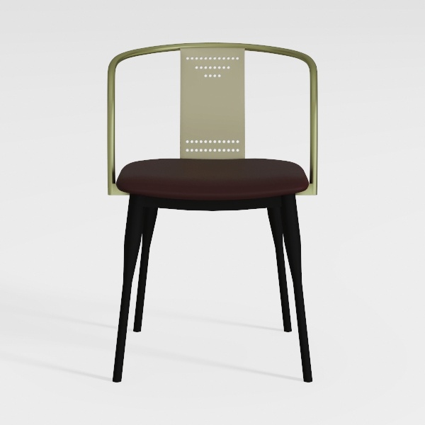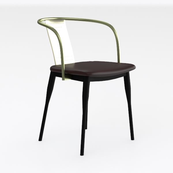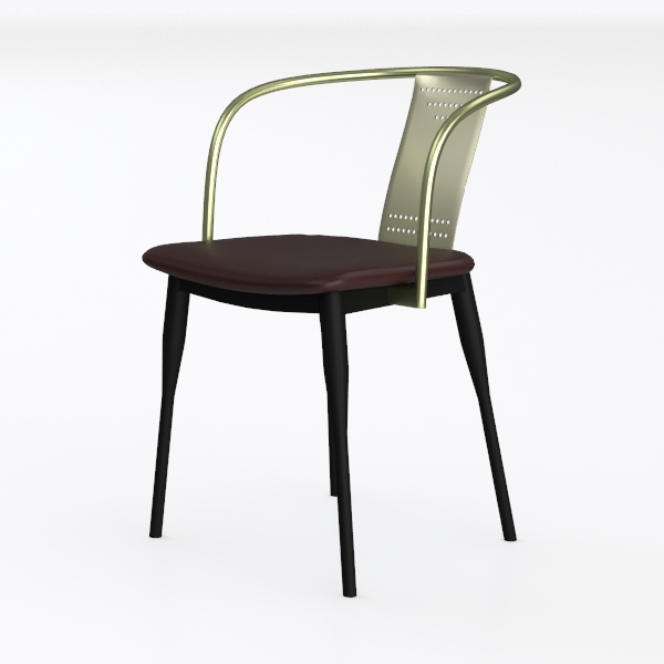 Inspired by the geometric precision of mid-century industrial design, this chair merges angular metalwork with soft upholstery to create a piece that feels both robust and refined. The frame, crafted from a warm brass-tone metal, features delicate perforations that filter light, casting subtle shadows across its surface and adding visual interest without overwhelming the design. The deep brown leather seat, with its smooth, supple texture, invites immediate comfort, while the contrast between the cool metal and the soft leather creates a tactile harmony.