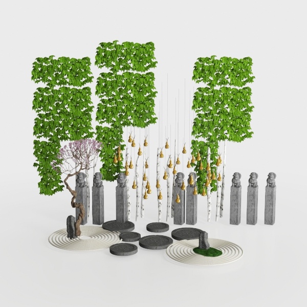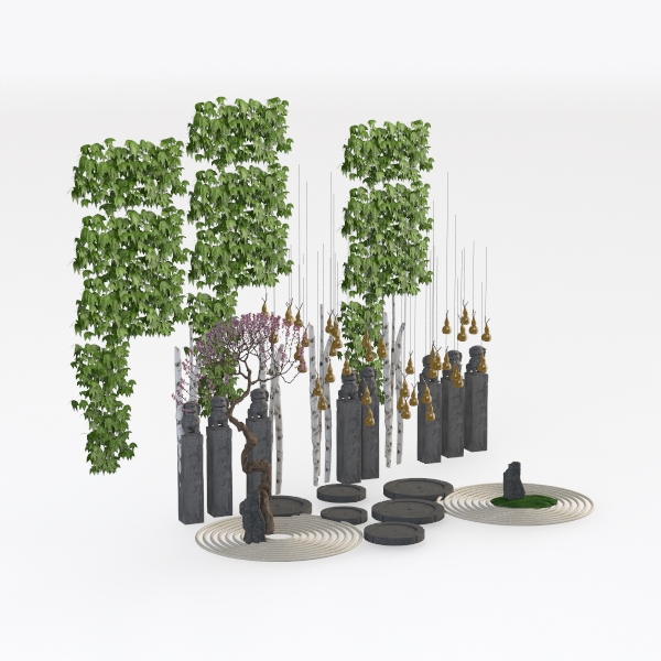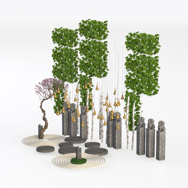 This design scene blends natural elements with geometric precision, drawing inspiration from traditional Eastern garden aesthetics reimagined through a modern lens. The composition features lush, lifelike greenery—thick, vibrant leaves that evoke a sense of living nature—paired with weathered gray stone pillars, each topped with subtle, stylized animal heads, adding a touch of timeless cultural character. Delicate, golden teardrop-shaped elements hang gracefully between the pillars, their metallic sheen catching light to create soft, warm reflections.