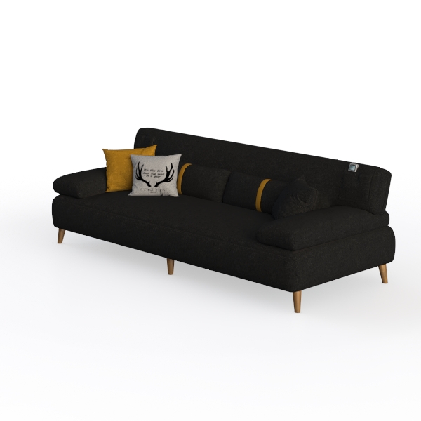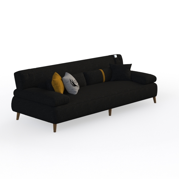 Introducing a stylish and sophisticated addition to your living space, this sleek black sofa is designed to elevate your interior decor. Drawing inspiration from modern minimalism, its clean lines and subtle details create a harmonious balance between form and function. The rich texture of the fabric invites gentle touch, while the contrasting decorative cushions in shades of gold and gray add a vibrant touch, making it the perfect focal point for any room.