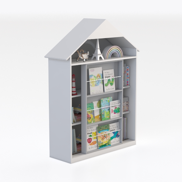 This charming piece features a playful, house-shaped design that evokes the warmth of a childhood dream, blending functionality with whimsy. The soft white exterior, crafted from smooth, high-quality material, feels cool yet inviting to the touch, its clean lines enhancing the bright, airy vibe of the space. The sloped roof, a key design element, adds a storybook charm, while the open shelving below, with its varied compartments, offers ample room to display colorful children’s books and small decorative items like mini airplanes, a tiny Eiffel Tower figurine, and a rainbow ornament, creating a visually engaging display that sparks imagination.