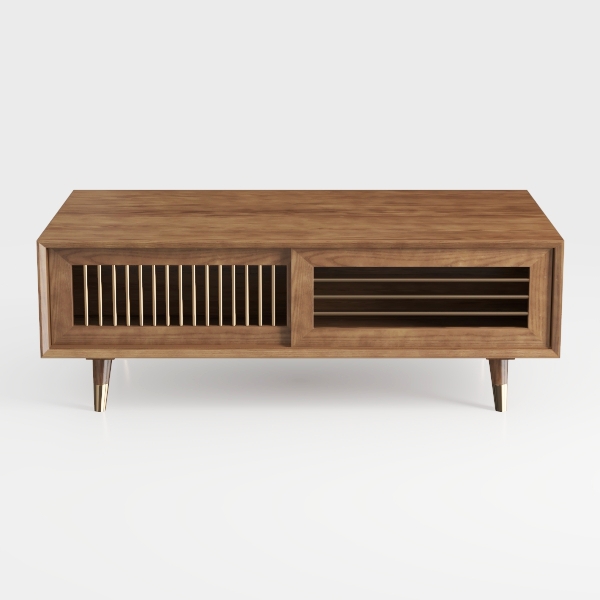 This wooden cabinet draws design inspiration from the seamless blend of organic wood textures and geometric precision, merging mid-century modern influences with contemporary functionality. Its warm, honey-hued finish, derived from high-quality solid wood, showcases rich, natural grain patterns that unfold like a story, adding depth and character to any space. The surface feels smooth and cool to the touch, with a subtle matte luster that softens light, while the contrast between the solid body and the open slatted doors creates dynamic visual rhythm.