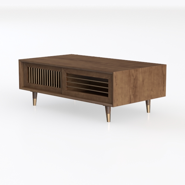 Mid Century Coffee Table with Storage & Sliding Fence Door, Modern Coffee Tables for Living Room, Walnut Finish