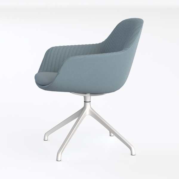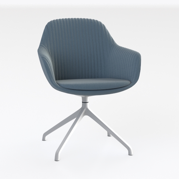 Visually, the chair’s sleek silhouette (rounded upper half, tapering to a crisp white metal base) radiates calm. The five-pointed star-shaped legs, slender and angular, add geometric precision, balancing the softness of the upholstery and enhancing stability.