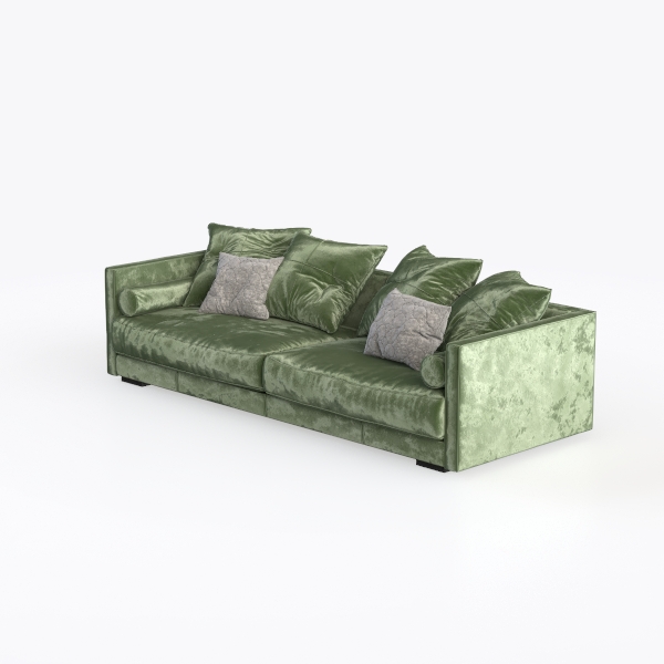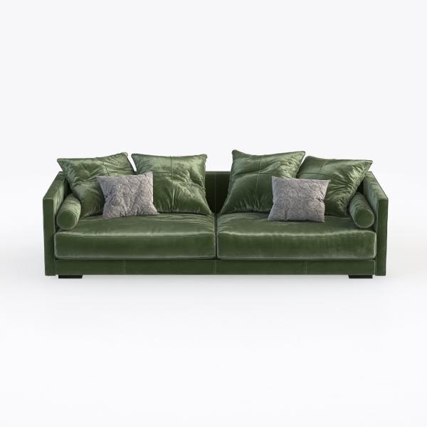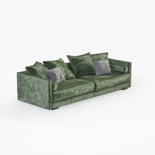 This elegant sofa draws its design inspiration from the lush, tranquil landscapes of nature, capturing the essence of serenity through its rich green upholstery. The plush velvet texture exudes a sumptuous feel, inviting you to sink into its embrace. Each cushion is generously filled, providing not just aesthetic appeal but also a luxurious tactile experience.