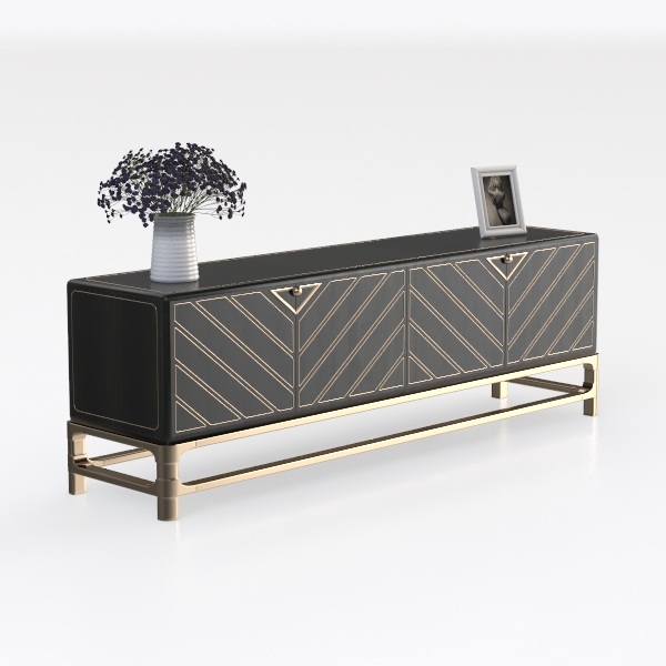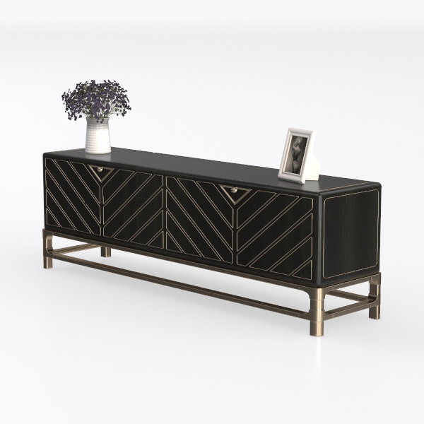 This elegant low-profile cabinet embodies a harmonious blend of modern minimalism and subtle art deco influences. Designed with symmetry and precision, its front face features a smooth, matte black surface adorned with intricate gold geometric patterns—resembling chevron or angular motifs—that trace the edges of the two large drawers, adding a touch of opulence without overwhelming the clean lines. The gold metal legs, with their slender, tapered design, lift the piece, creating a light, airy base that contrasts beautifully with the solid lower half and enhances the overall sense of balance.