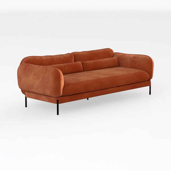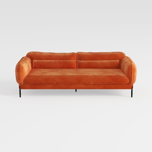 This sofa embodies a blend of organic softness and mid-century modern charm, drawing inspiration from natural curves and warm, earthy tones. Its velvety texture is instantly inviting—gentle to the touch, with a subtle sheen that catches light softly, enhancing the rich terracotta hue. The plump, rounded armrests and low-profile silhouette create a cozy, enveloping feel, while sleek black slim legs add a contemporary, lightweight contrast, keeping the design from feeling bulky.