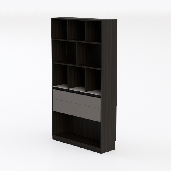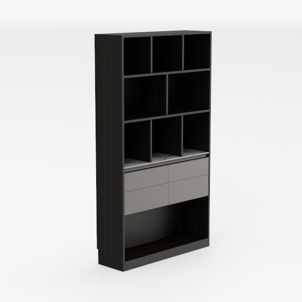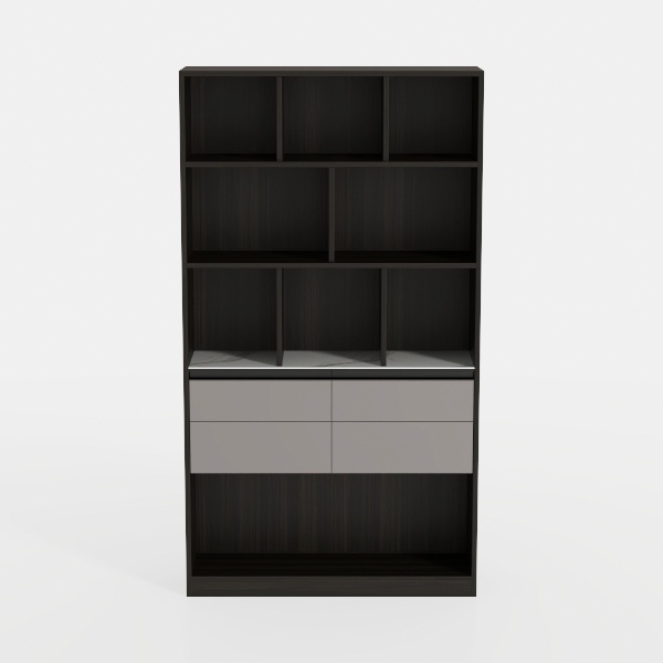 Visually, the structure features a striking contrast between deep, rich dark wood tones—with subtle grain patterns that add warmth—and soft, matte light gray panels, creating a sophisticated interplay of depth. The wood surface feels smooth and cool to the touch, with a slight matte finish that avoids glare, while the gray drawers offer a tactile contrast, their edges sharp and precise. The overall silhouette is tall and narrow, with a balanced grid of open shelves and closed storage, ensuring a streamlined look that doesn’t overwhelm small spaces.