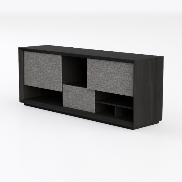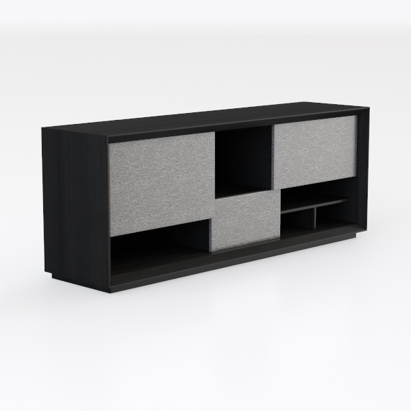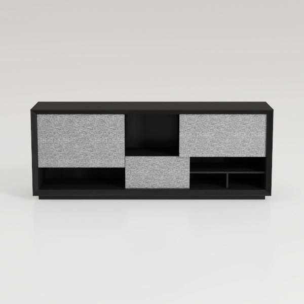 Drawing inspiration from contemporary minimalism, this storage piece merges geometric precision with organic warmth, aiming to transform living spaces into balanced sanctuaries. Its frame, crafted from smooth, matte black material, exudes a grounded, industrial edge, while the textured gray panels—with their subtle, woven-like pattern—introduce soft tactile contrast, inviting gentle touches. The interplay of dark and light surfaces creates a visual rhythm: the solid black base grounds the design, while the light gray panels lift it, making the piece feel both substantial and ethereal.