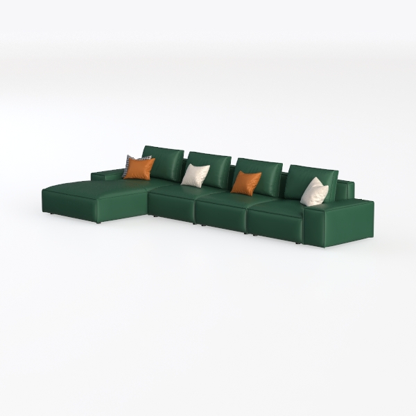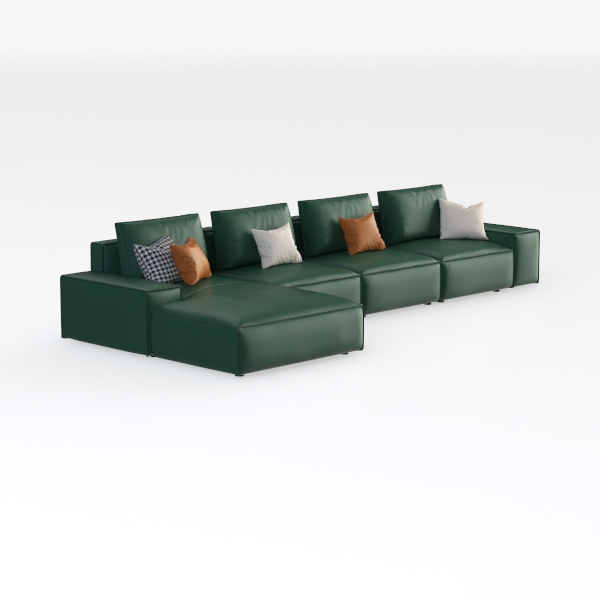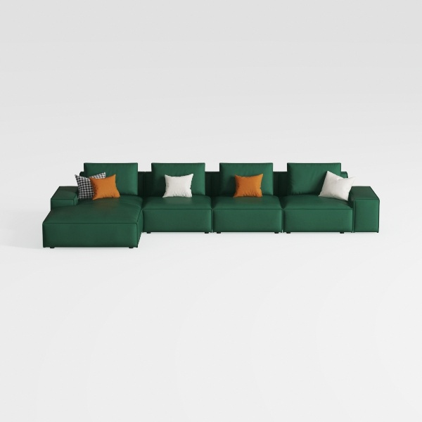 This stunning sectional sofa draws its design inspiration from modern minimalism, creating an inviting focal point for any living space. Dressed in a rich emerald green fabric, its texture exudes a soft, luxurious feel, inviting you to sink into its comfortable embrace.