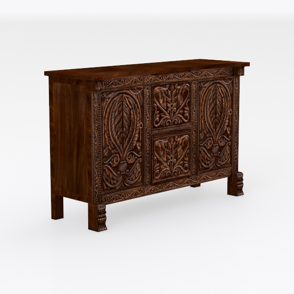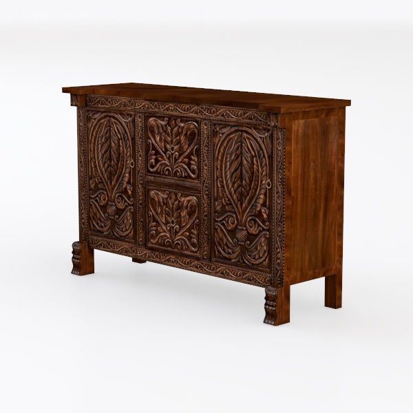 This elegant wooden cabinet draws inspiration from the timeless allure of classical woodworking, where lush botanical motifs and intricate scrollwork converge to create a piece that feels both historical and deeply personal. The deep, warm brown hue of the wood, enhanced by a subtle, polished finish, reveals the natural grain and texture of the material, while the meticulously carved patterns—featuring swirling vines, delicate leaves, and symmetrical floral centers—add layers of visual interest. Running the length of the cabinet, these carvings are rendered with such precision that they seem to dance in the light, capturing attention and evoking a sense of craftsmanship rarely seen today.