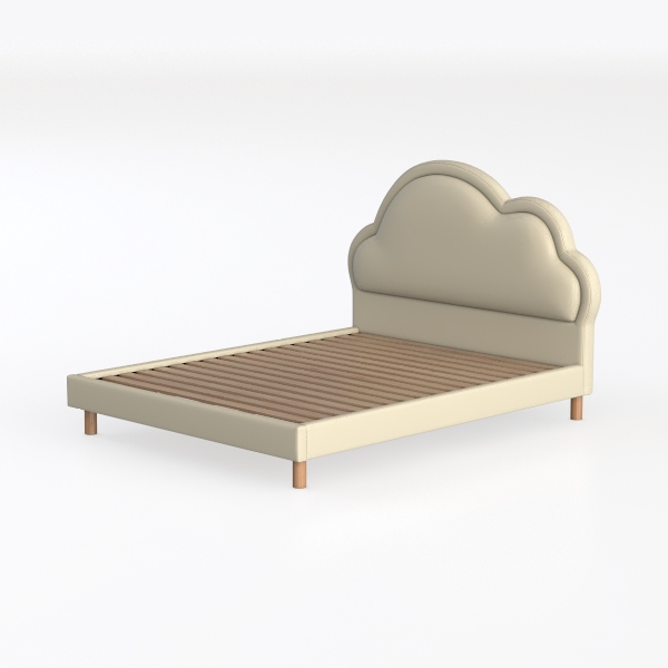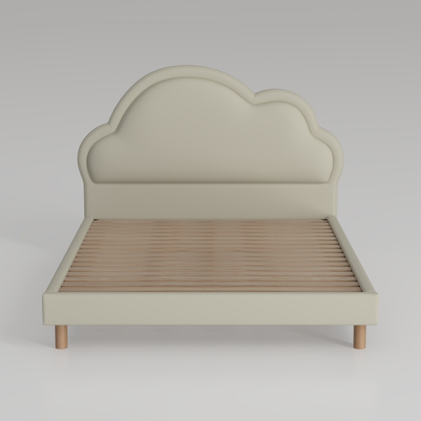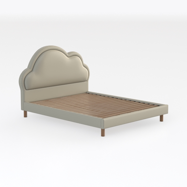 Drawing inspiration from the soft, undulating shapes of cumulus clouds, this bed frame merges whimsy with modern simplicity, creating a piece that feels both playful and refined. The headboard, upholstered in a smooth, light taupe fabric, curves gently like a puffy cloud, its edges rounded and inviting to the touch—soft yet structured, it offers a comforting surface for leaning back with a book or chatting with a partner. The bed base, crafted from warm oak slats, adds a natural contrast, their light wood grain and horizontal lines balancing the headboard’s organic curves, while the slender, tapered legs in a matching oak tone keep the design grounded and uncluttered.