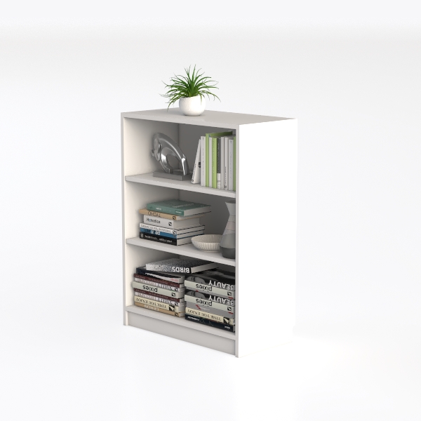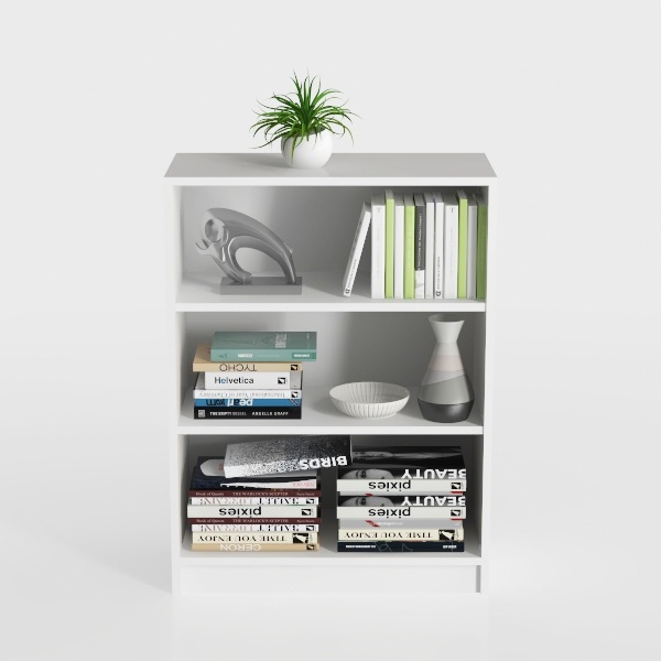 Visually, its crisp white surface—with a smooth, cool-to-touch matte finish—reflects light, making the room feel brighter and more open. On its three carefully spaced shelves, a curated arrangement of items adds depth: a sculptural gray object, a lush potted plant, stacked books, and a gradient ceramic vase create a balanced mix of textures and colors, avoiding clutter while highlighting each piece.