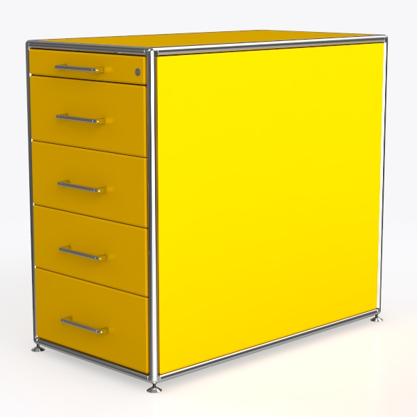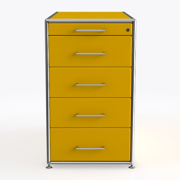 The five drawers feature a smooth, matte mustard-yellow finish that feels cool and tactile to the touch—warm yet not overwhelming, with a subtle depth that catches light softly. The chromed metal frame, with its angular, geometric structure, adds a sleek, polished edge; its silver sheen contrasts sharply with the vibrant drawer fronts, creating a dynamic visual rhythm. The slim, horizontal handles, seamlessly integrated into the drawer faces, enhance the unit’s streamlined silhouette, making opening and closing effortless.