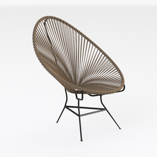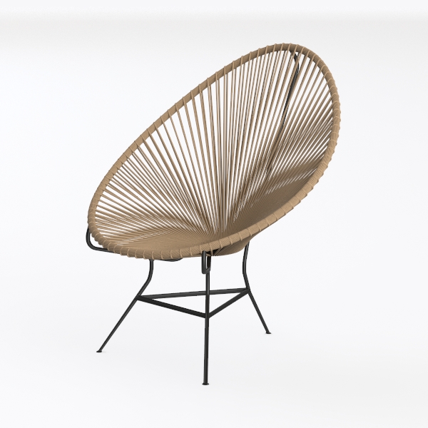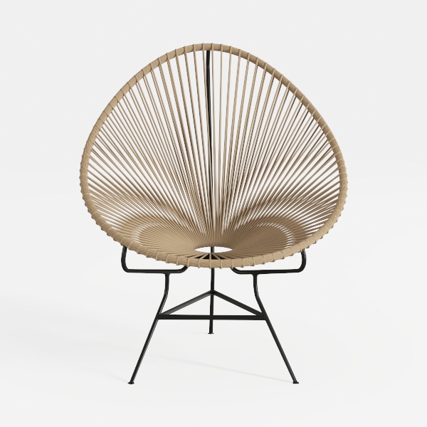 This lounge chair radiates a serene blend of organic charm and modern simplicity. Its iconic shell-like silhouette, with delicate, interwoven lines curving outward, draws inspiration from the fluidity of natural forms—think smooth seashells or the soft arc of a hammock, evoking a sense of calm and relaxation. The warm, earthy tone of the woven material, a soft sand or driftwood hue, contrasts subtly with the sleek, matte black metal frame, creating a balanced interplay of texture and structure.