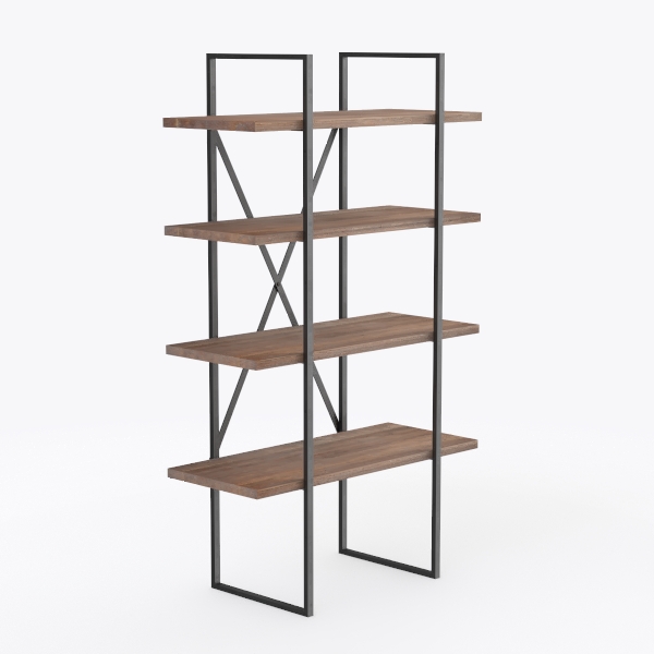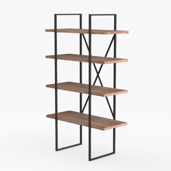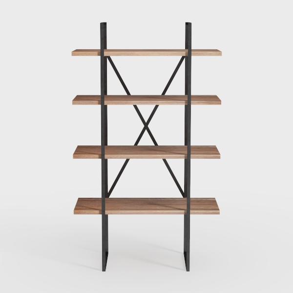 This elegant freestanding shelving unit blends industrial-inspired structure with organic warmth, creating a versatile piece for modern living spaces. Its design draws from the harmony of geometric precision and natural materials, merging the clean lines of industrial aesthetics with the tactile richness of wood. The crossed metal supports, with their matte black finish, echo the robustness of industrial design, while the wooden shelves, featuring visible grain patterns, infuse a sense of organic calm.