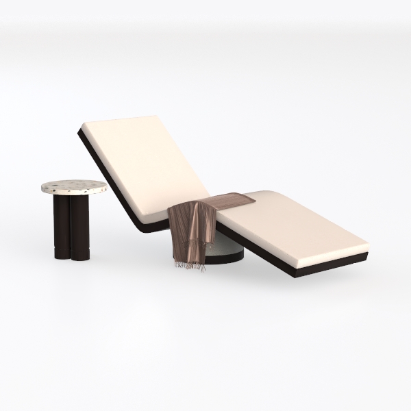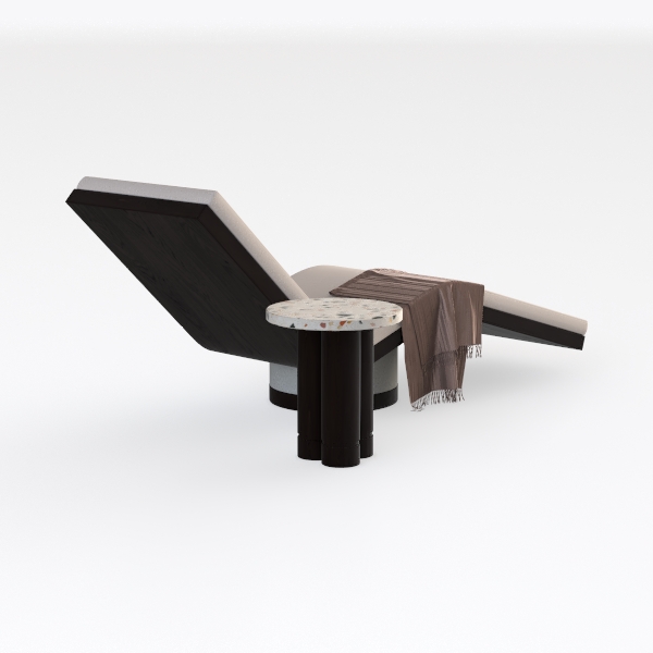 The lounge is beautifully complemented by a round side table featuring a speckled top and sturdy cylindrical legs, perfect for holding drinks or books. When placed in a chic modern lounge or a serene reading nook, it transforms your space into a luxurious retreat. Picture it alongside a marble coffee table and a sleek metallic floor lamp for a complete modern luxe look.