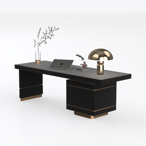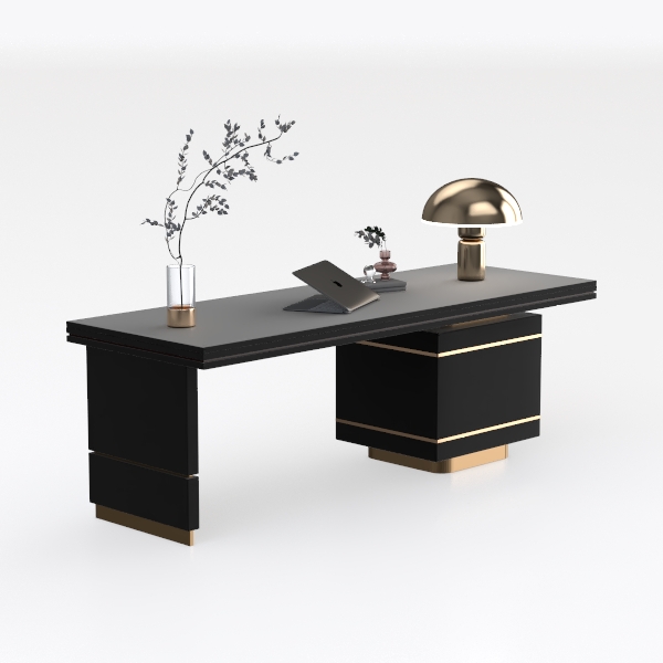 Inspired by mid-century modern minimalism, this home furniture blends clean lines with subtle art deco accents. Sleek, polished black surface contrasts with warm gold trim, creating a sophisticated, tactile allure that catches light softly. Ideal for a contemporary home office, it pairs beautifully with marble accessories and metallic lamps, offering a generous work surface and integrated drawer for practical storage.