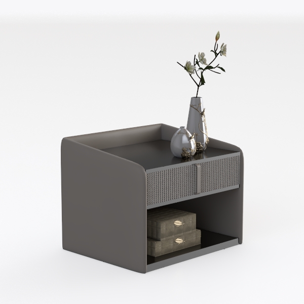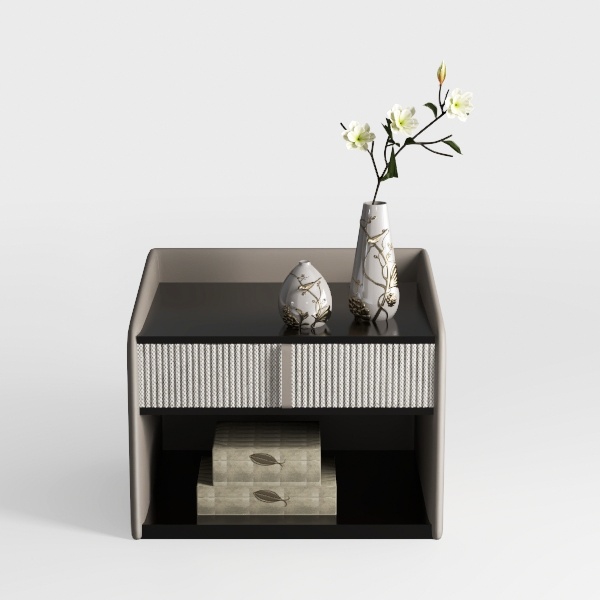 Inspired by the harmony of natural textures and minimalist design, it blends subtle organic patterns with crisp lines. The soft woven drawer front, smooth matte black top, and warm neutral frame create a tactile mix of softness and coolness, visually balanced and elegant. Ideal for a modern minimalist living room or bedroom, pairing seamlessly with marble accents and metallic decor for a touch of understated luxury. A lower open shelf stores stacked books or decor, while a top drawer offers hidden storage, balancing style and practicality.