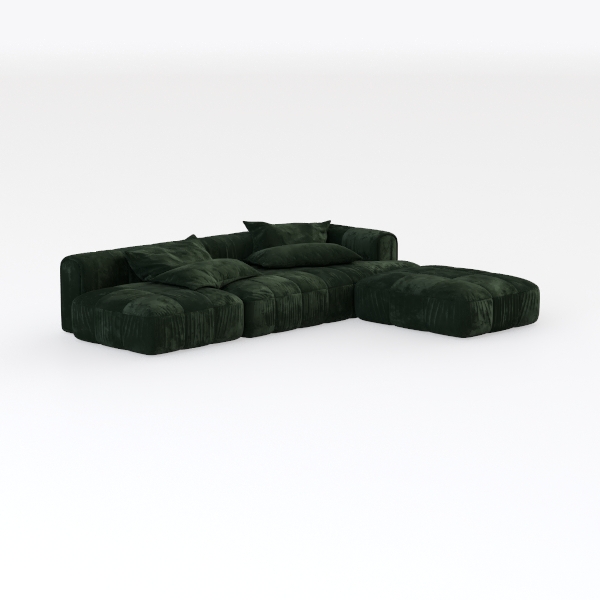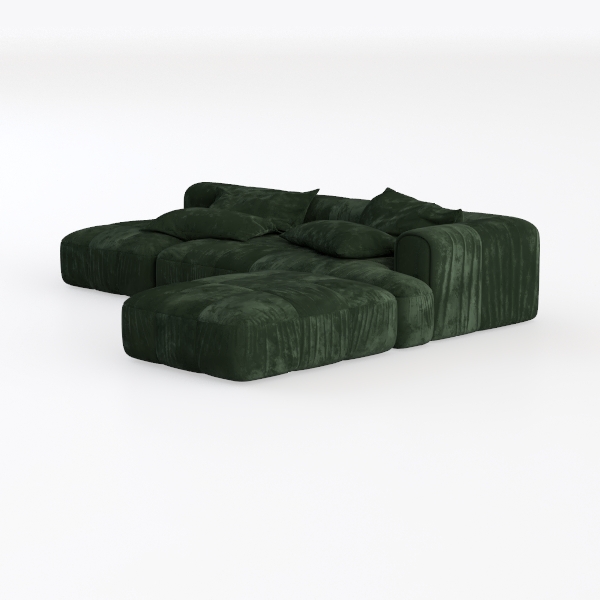 The design takes cues from the organic rhythm of nature and the adaptability of modern living, blending the softness of a mossy forest floor with the sleekness of geometric minimalism. Its rich, deep emerald upholstery shimmers subtly under light, evoking the lushness of aged leather and the supple texture of crushed velvet, while the modular block structure—with its gentle curves and interconnected sections—feels both intentional and effortless, like a carefully arranged stack of cloud-like cushions.