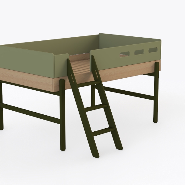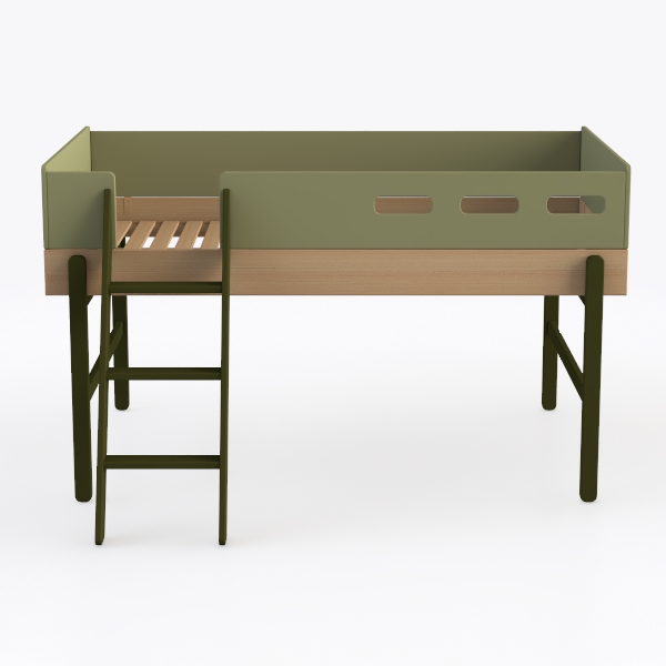 Inspired by space-saving design and natural coziness, this elevated bed features smooth wooden slats and a sturdy metal frame, blending minimalist charm with warm texture. Its soft olive-green headboard and light wood base create a gentle, inviting look, perfect for a kids' room or compact space. The slatted structure ensures breathability, while the integrated ladder and under-bed area add practicality, ideal for pairing with playful decor and potted plants.