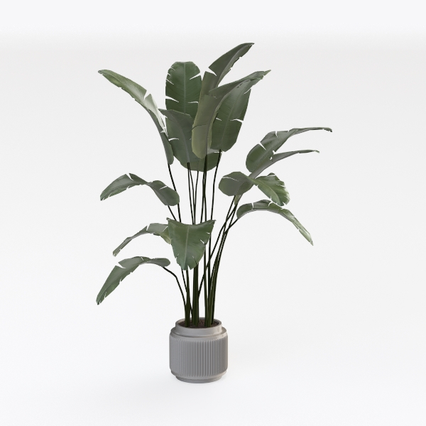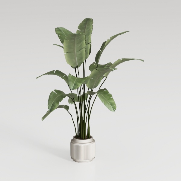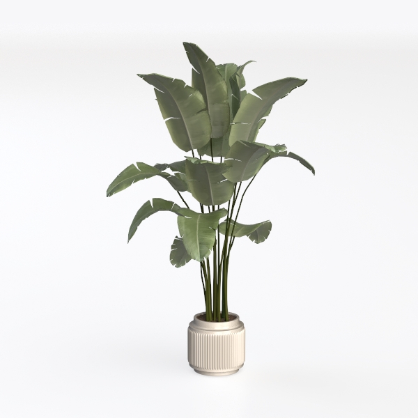 Inspired by tropical nature, this lush potted plant features broad, sleek leaves with a glossy sheen, contrasting the smooth, ribbed ceramic pot. Its vibrant green foliage adds fresh, airy energy to modern minimalist or Scandinavian spaces, pairing beautifully with light wood furniture and soft walls. Beyond decoration, it purifies the air, blending aesthetics and well-being seamlessly.