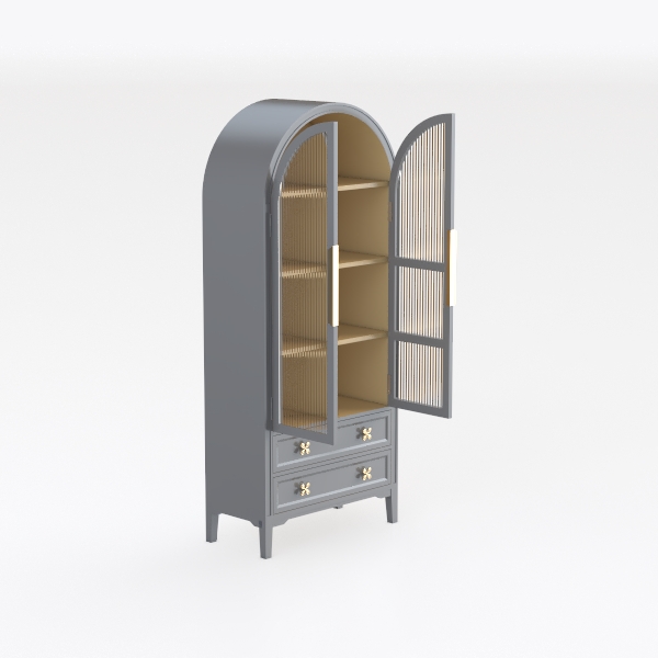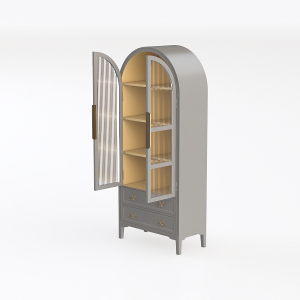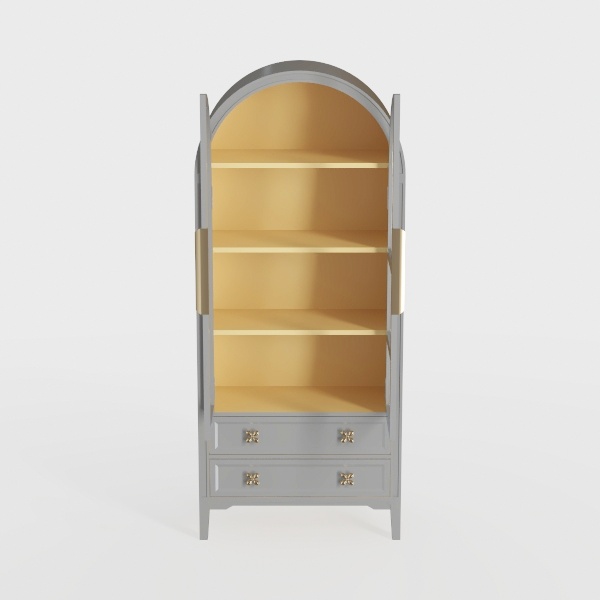 Inspired by classic 18th-century design, this elegant cabinet features a sleek matte gray exterior, smooth golden interior, and delicate gold accents. Its arched top and structured silhouette create a refined, timeless look, perfect for a classic living room or study. Spacious drawers offer ample storage, blending aesthetic charm with practical utility, ideal with marble-topped side tables and vintage brass floor lamps.