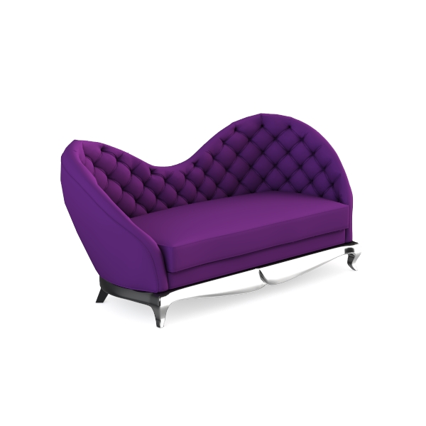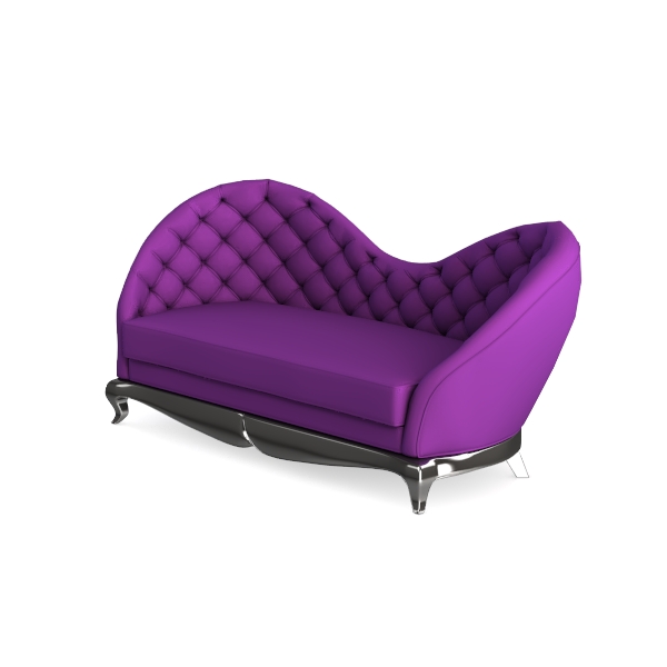 The seat boasts a rich, eggplant-purple fabric that feels buttery-soft to the touch, with each tufted diamond creating subtle dimples that catch light, enhancing its depth. The contrast between the warm, plush material and the sleek, chrome-finished legs—slender, angled, and polished—adds a striking modern edge, balancing the sofa’s softness with structural sharpness.