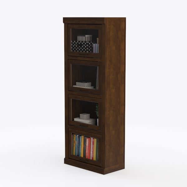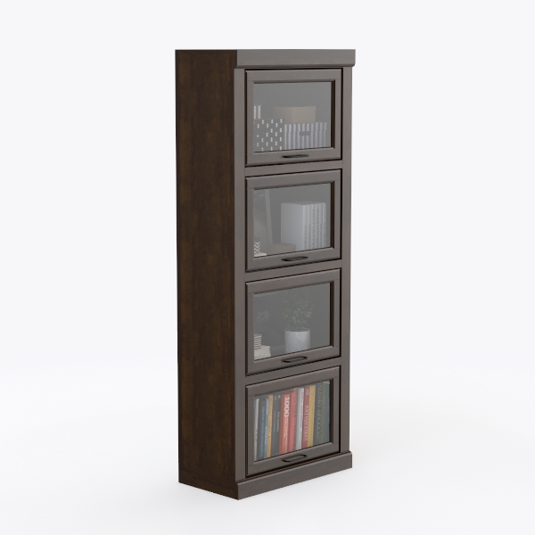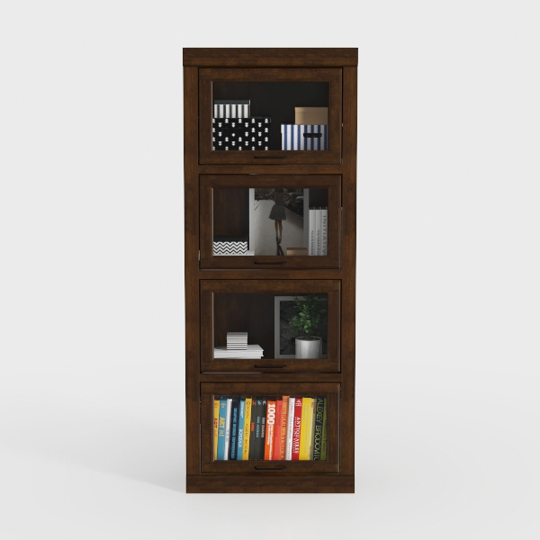 Designed to blend traditional storage with modern minimalism, this tall cabinet has warm, dark wood with smooth surfaces and natural grain. Clear glass doors add transparency, showcasing books and decor. Ideal for modern living rooms or cozy home offices, pair with a plush sofa, woven rug, and succulents. Four shelves offer ample space for books, plants, and decor, balancing elegance and functionality.