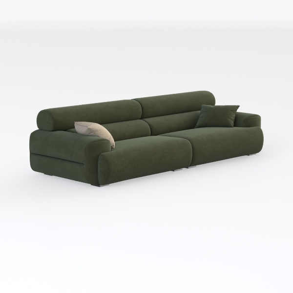 Drawing inspiration from the organic flow of natural landscapes and the cozy allure of mid-century design, this sofa merges modern simplicity with timeless warmth. Its rich, olive-green upholstery—crafted from a soft, textured fabric—feels surprisingly inviting to the touch, with each strand catching light to create a subtle, inviting depth. The rounded armrests and block-like, seamless structure balance bold presence with gentle curves, making it a focal point that feels both intentional and approachable.