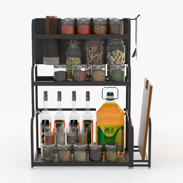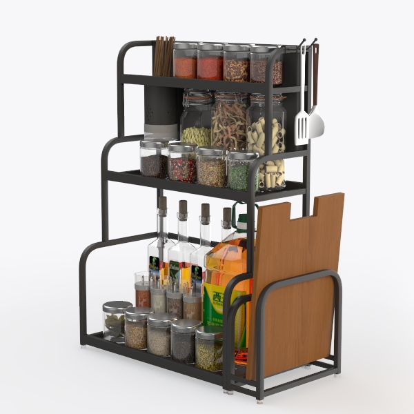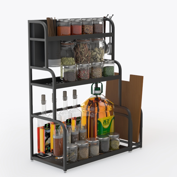 Inspired by kitchen organization needs, it blends functionality with sleek design to maximize space. A matte black metal frame contrasts with clear glass jars, creating a clean, modern look. Three-tiered structure organizes spices, oils, and utensils, saving counter space while ensuring easy access to daily cooking essentials. Perfect for modern minimalist or industrial kitchens, pairing well with wooden or marble countertops.