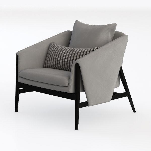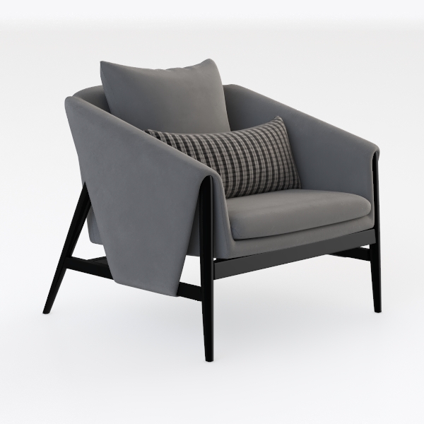 Designed with minimalist Scandinavian inspiration, this armchair blends soft, velvety gray upholstery with sleek black legs. Curved armrests and a deep, plush seat deliver exceptional comfort, while a striped lumbar pillow adds subtle texture. Ideal for a modern living room, it pairs with marble coffee tables and metallic accents, enhancing style and relaxation.