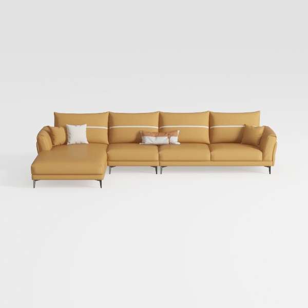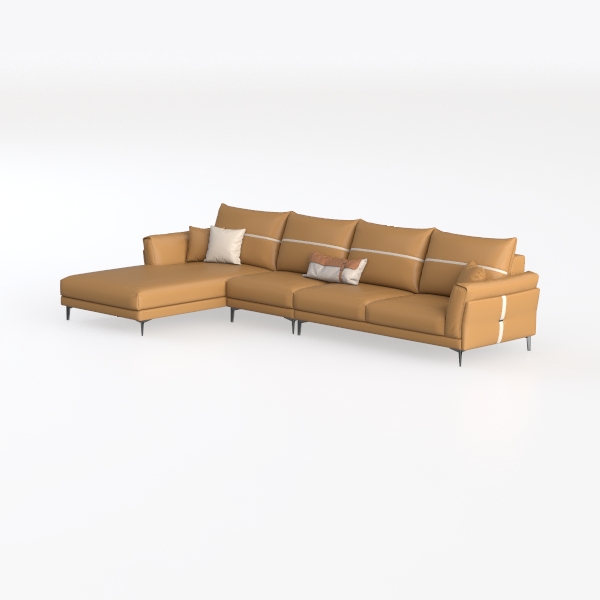 Drawing inspiration from the gentle interplay of natural warmth and modern simplicity, this L-shaped sofa embodies a design philosophy that prioritizes both aesthetic appeal and everyday comfort. The soft, amber-toned upholstery—reminiscent of honeyed light filtering through curtains—radiates a warm, inviting glow, while crisp white stitching lines trace the edges of its generously sized cushions, adding subtle definition to its streamlined silhouette.