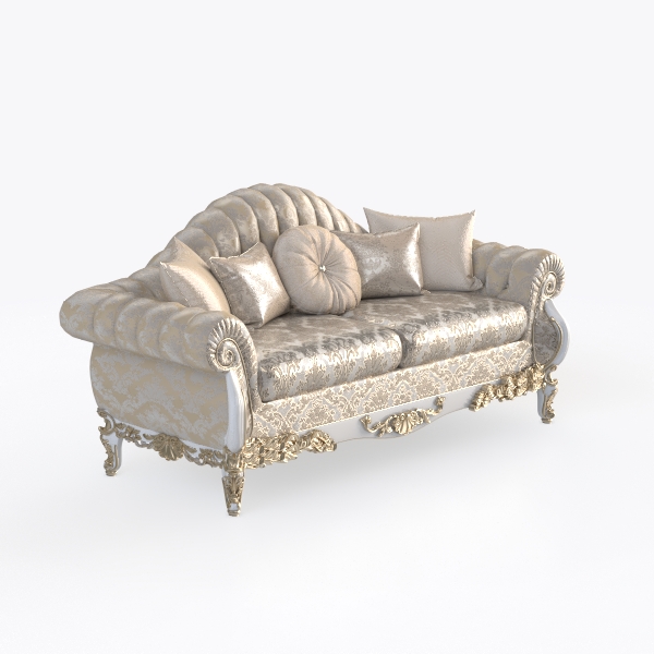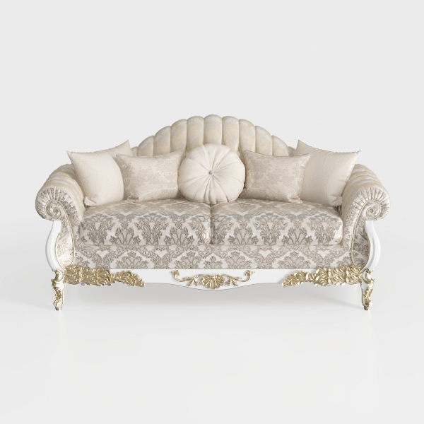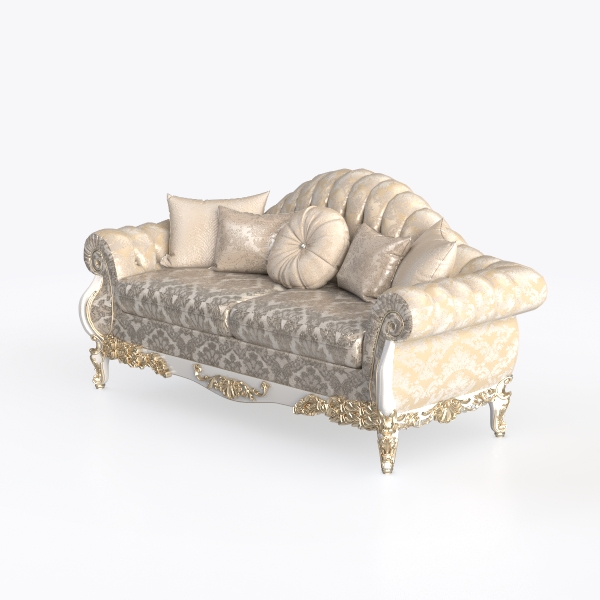 Drawing inspiration from the grandeur of 18th-century European palaces, this sofa blends historical elegance with contemporary comfort. Its curved silhouette, reminiscent of classical architectural lines, is framed by meticulously carved golden floral motifs along the armrests and base, infusing the piece with a sense of timeless luxury.