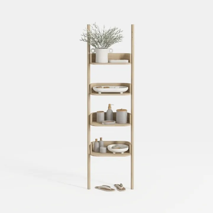 With four thoughtfully spaced shelves, it offers versatile storage: the top shelf holds a small plant for freshness, the middle layers accommodate toiletries or decorative bowls, and the bottom shelf neatly stores slippers. Its sturdy construction ensures durability, while the lightweight design makes it easy to move, ideal for maximizing space without overwhelming a room.