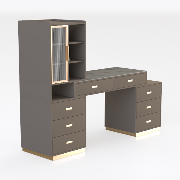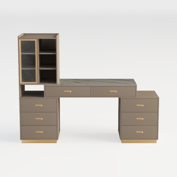 Inspired by balancing modern minimalism and classic elegance, this desk blends clean lines with refined details. Warm beige cabinetry, smooth marble top, and gold metal handles create a visually rich, tactilely satisfying look. Ideal for modern-luxury studies or bedrooms, pair with wooden shelves and metallic lamps. Three drawers on each side offer ample storage; a spacious counter and left shelves display books/decor, merging style and function.