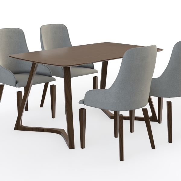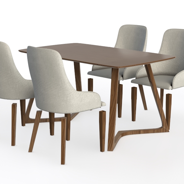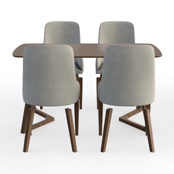 Inspired by Scandinavian minimalism, this dining set merges clean lines with organic warmth. The warm wooden tabletop contrasts gently with soft gray upholstered chairs, their sleek, angled legs adding modern elegance. Perfect for a contemporary dining room, it pairs beautifully with marble accents and metallic light fixtures, enhancing the space’s sophistication. Plush upholstery and a wide seat depth ensure long-lasting comfort, while the sturdy frame guarantees stability for daily use.