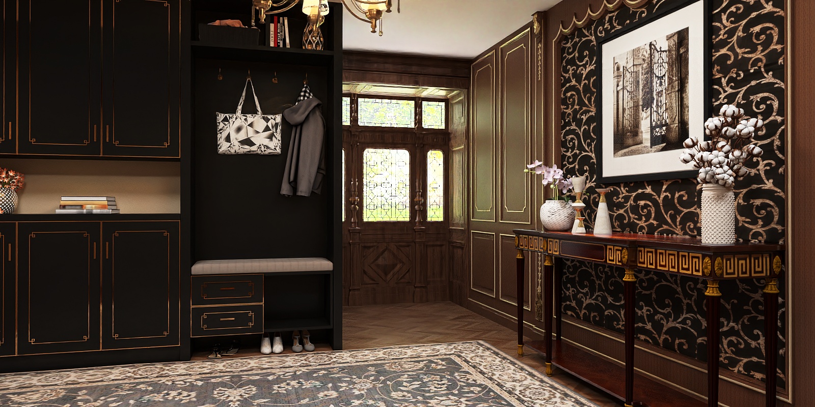 Inspired by classical motifs, its top features a rich, dark finish with intricate gold meander patterns, evoking timeless elegance. The smooth, polished wood feels cool to the touch, while the gold accents add a warm glow, creating a striking contrast against the deep, muted base. Perfect for a grand hallway or formal living room, it complements both traditional and contemporary settings, pairing beautifully with marble vases and brass floor lamps. A lower shelf offers extra storage, while the slender, tapering legs ensure stability, blending functionality with sophisticated design.