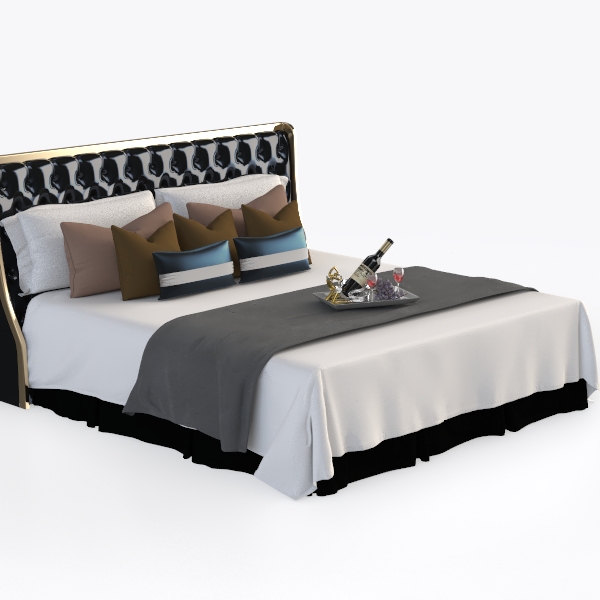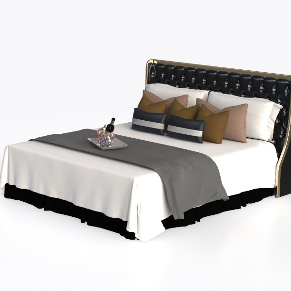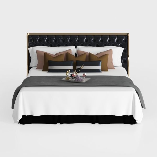 Inspired by timeless luxury, the bed features a sleek black leather headboard with tufted details, exuding elegance. Gold metal trim adds opulence, while soft white linen and a gray throw create warmth. Ideal for modern-luxury bedrooms, it pairs beautifully with marble nightstands and metallic accents. Ample padding ensures ultimate comfort, perfect for unwinding after a long day.