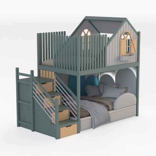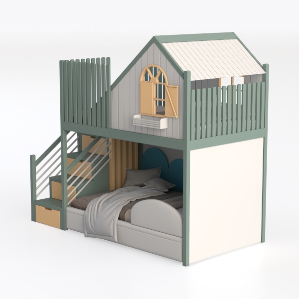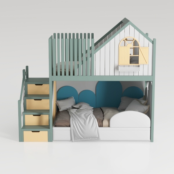 Inspired by whimsical cottage designs, this bed blends fairy tale charm into a kids' space. Smooth wooden textures and soft pastels—muted greens, whites, and blues—create a light, cozy vibe, mimicking a tiny house. Perfect for playful yet warm kids' rooms, pair with colorful art and soft rugs. Staircase with built-in drawers adds storage, and the spacious lower bed with plush bedding ensures comfort.