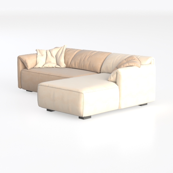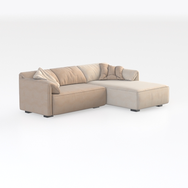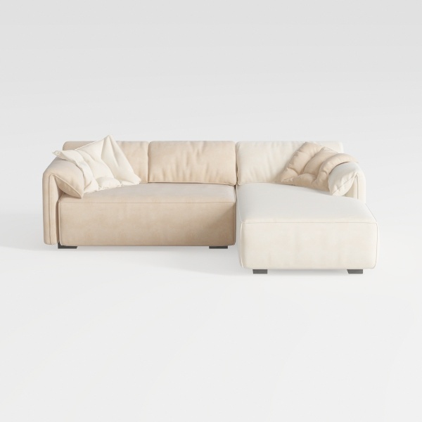 The upholstery features a sumptuously soft, matte-finish fabric—cool to the touch yet subtly yielding, as if crafted from premium wool or cashmere. The two-tone palette of warm beige and soft ivory enhances its airy presence, with clean, unadorned sides that let its proportions take center stage. The gentle curve of the backrest and the generous depth of the seat invite relaxation, while the modular layout (with a compact chaise) maximizes space without overwhelming the room.