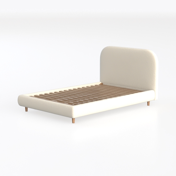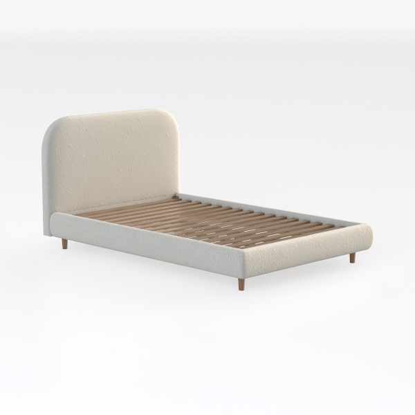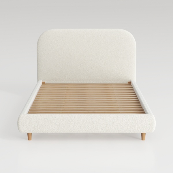 Inspired by soft cloud forms, this bed features a soft, textured bouclé upholstery on its clean, curved headboard, exuding warmth and comfort. Ideal for a calm, minimalist bedroom, it pairs beautifully with light wood furniture and linen bedding. Sturdy wooden slats ensure optimal mattress support, while its low-profile design saves floor space.