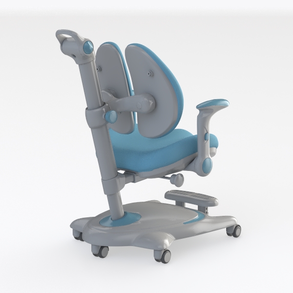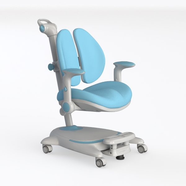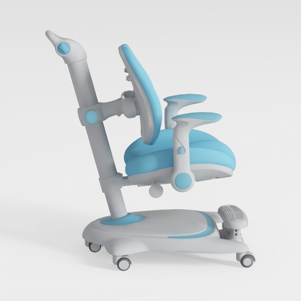 Inspired by child-friendly, ergonomic design, this chair features a soft, sky-blue padded seat contrasting with smooth gray frame. Its gentle curves and vibrant hue create a cheerful, inviting look, perfect for a kid’s study nook or modern playroom. Adjustable armrests and a footrest support proper posture, while smooth wheels ensure easy movement.