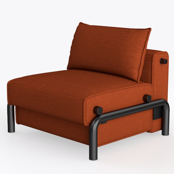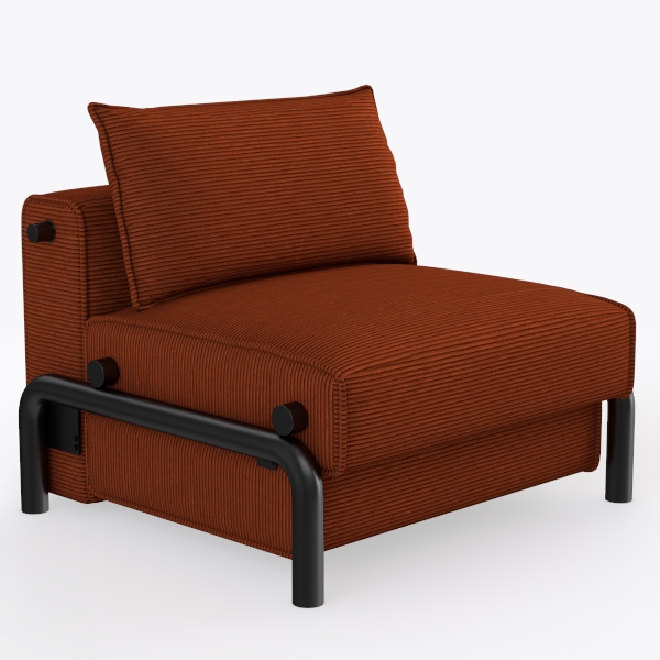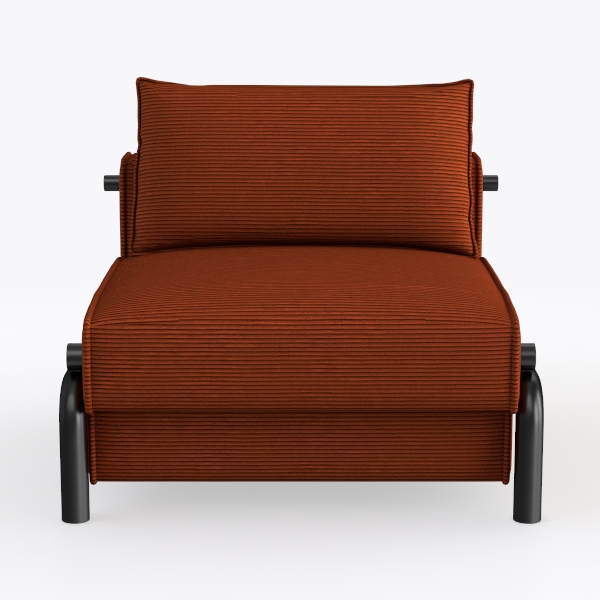 This armchair draws inspiration from mid-century modern design, merging retro warmth with contemporary minimalism. Its soft, ribbed upholstery in a rich terracotta hue feels inviting to the touch—plush yet structured, with vertical lines that catch light gently, adding subtle depth to its silhouette. The curved backrest and generous seat depth cradle the body, offering exceptional comfort for long hours of relaxation, while high-density foam cushions retain their shape, ensuring durability without sacrificing softness.
