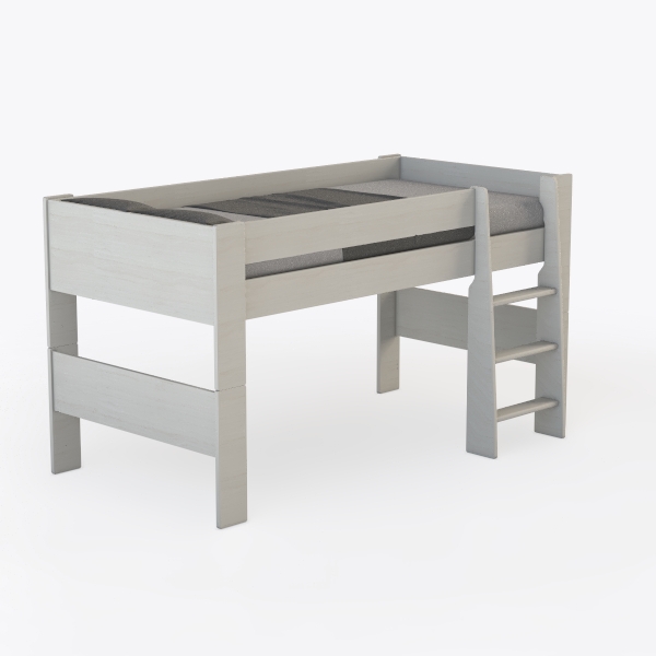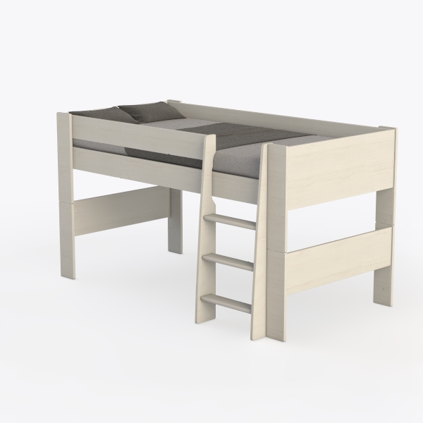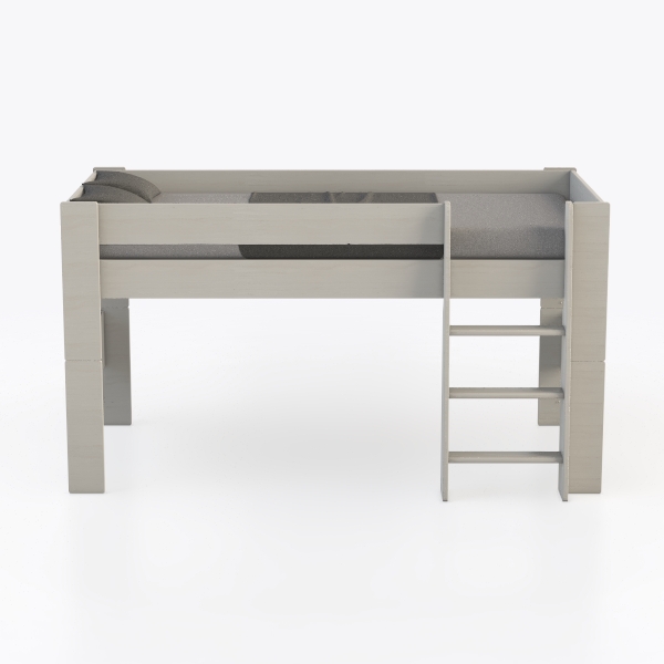 Inspired by space-saving design and minimalist aesthetics, this elevated bed blends functionality with calm charm. Crafted with smooth, light-toned wood, its clean lines and matte finish create a serene, airy feel. Perfect for compact children’s rooms or small bedrooms, ideal for modern, Scandinavian, or minimalistic styles. The raised base frees floor space for desks or storage, while the sturdy ladder ensures easy access to the cozy, gray upholstered bed.