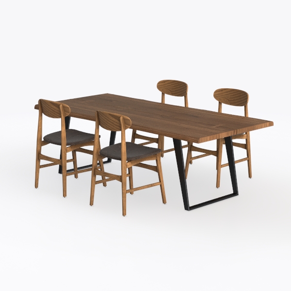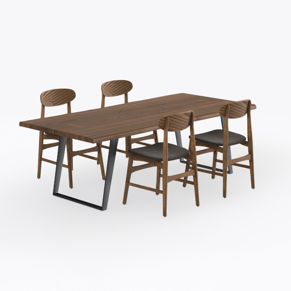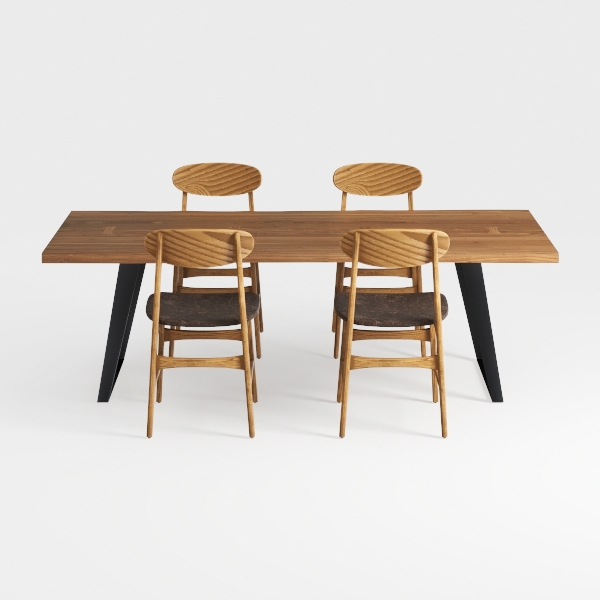 Inspired by the blend of natural wood grain and geometric precision, this dining set features a warm wooden table with slanted grain patterns, its smooth surface offering a tactile delight. Black metal legs add a sleek, modern contrast, balancing the softness of wood. Ideal for minimalist or Scandinavian dining spaces, it pairs well with neutral decor and potted plants. Sturdy construction and comfortable upholstered seats ensure both style and daily comfort for family meals or gatherings.