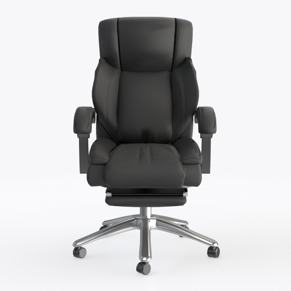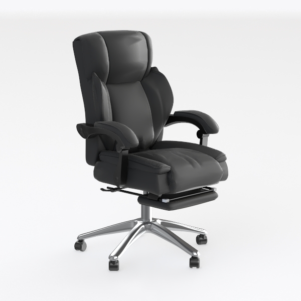 Designed for optimal comfort in modern workspaces, blending sleek lines with functional support. Crafted from smooth, high-quality black leather, its polished surface catches light subtly, while the generously padded backrest and seat offer exceptional lumbar support. The extendable footrest and smooth-rolling casters enhance relaxation, making it ideal for minimalist home offices or sleek executive spaces, pairing seamlessly with wooden desks and metallic accents.