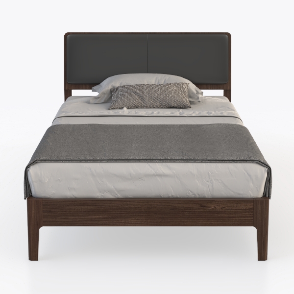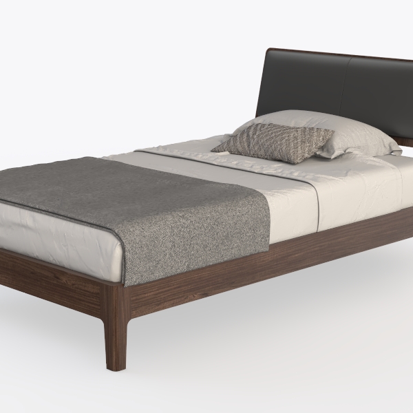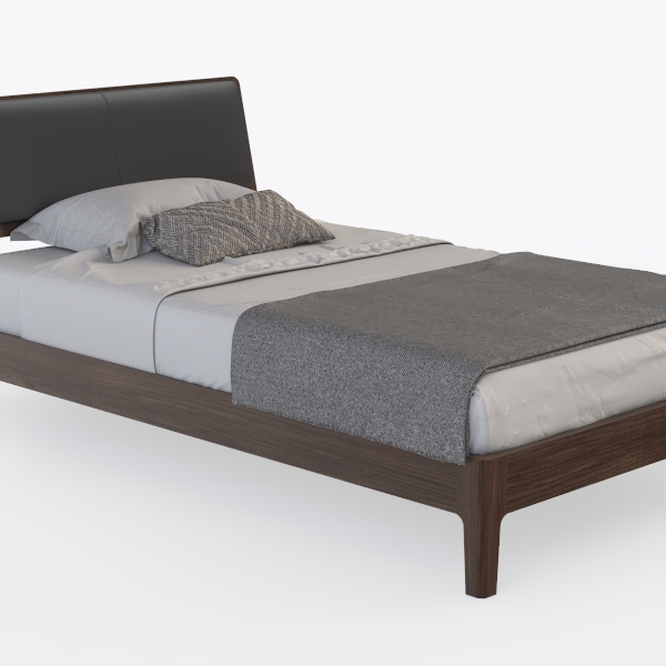 Design inspired by organic wood grain and clean Scandinavian lines, this bed features a warm walnut frame with a smooth leather headboard. Soft linen sheets and textured cushions add layers of comfort, while its sleek silhouette creates a calm, inviting atmosphere. Ideal for minimalist or Scandinavian bedrooms, it pairs beautifully with wooden nightstands and ambient lighting, offering sturdy support and gentle backrest for relaxation.