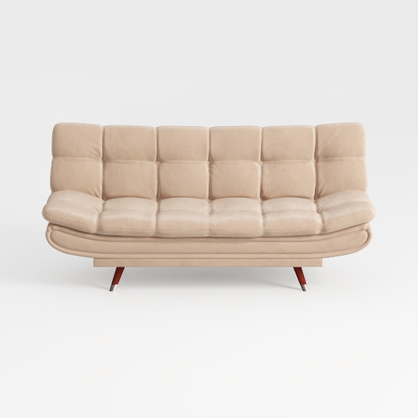 Inspired by mid-century modern design, this sofa weaves nostalgic warmth with contemporary comfort, drawing from 20th-century craftsmanship while feeling fresh and inviting. The soft, warm beige upholstery has a velvety texture that invites gentle touches, with neatly aligned square tufts creating subtle dimension. Its curved, low-profile silhouette—with gently sloping arms and a streamlined base—flows seamlessly, making the piece feel both substantial and airy, while the slim, tapered wooden legs ground it in elegant stability.